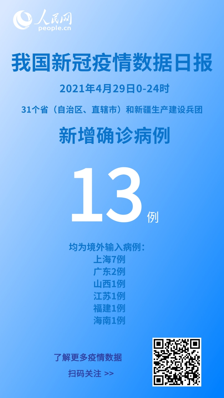 人民网北京4月30日电 (记者崔元苑)今日,国家卫生健康委于官网发布了截至4月29日24时新型冠状病毒肺炎疫情最新情况。4月29日0—24时,31个省(自治区、直辖市)和新疆生产建设兵团报告新增确诊病例13例,均为境外输入病例(上海7例,广东2例,山西1例,江苏1例,福建1例,海南1例);无新增死亡病例;新增疑似病例3例,均为境外输入病例(上海2例,内蒙古1例)。