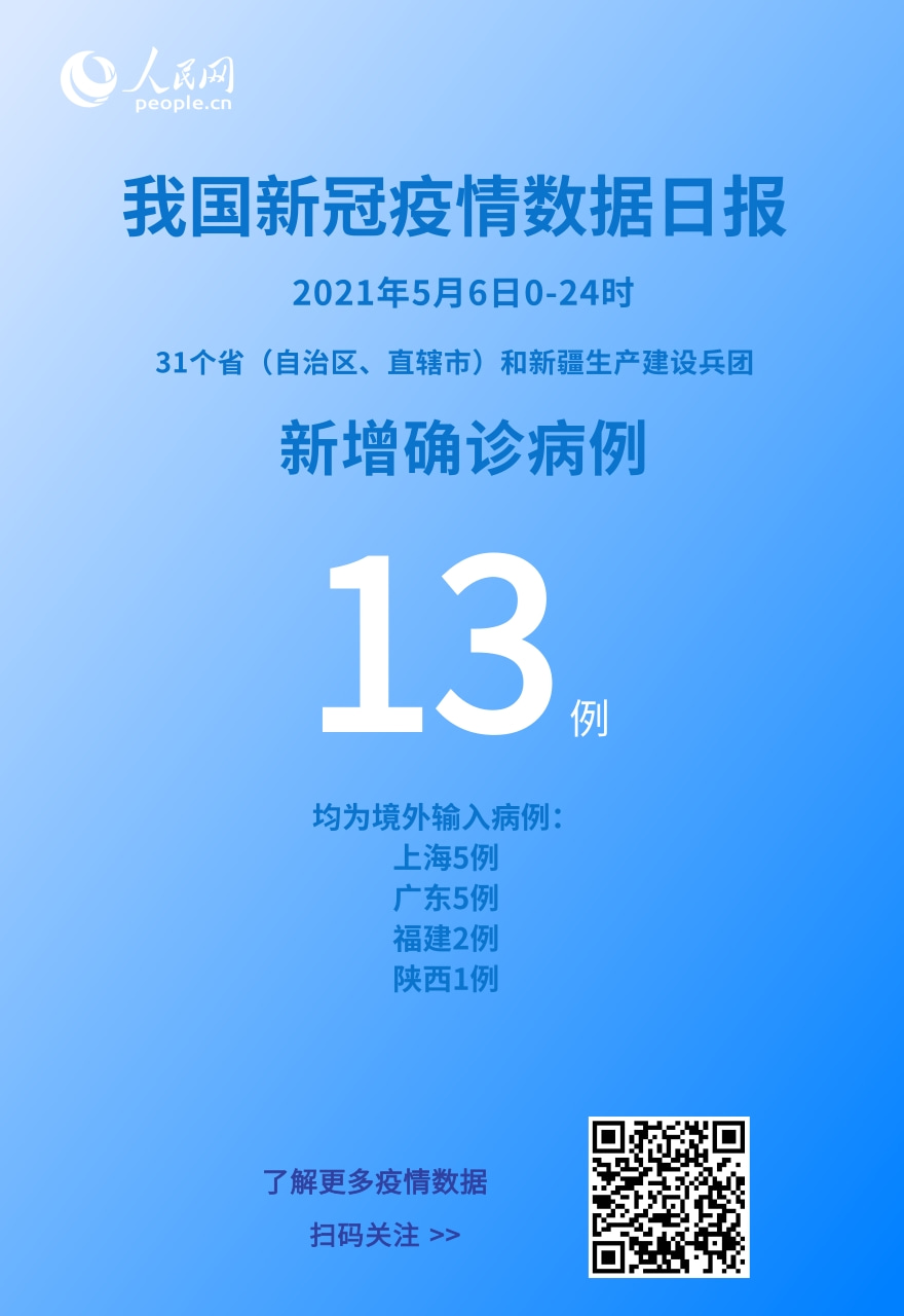 人民网北京5月7日电 (记者崔元苑)今日,国家卫生健康委于官网发布了截至5月6日24时新型冠状病毒肺炎疫情最新情况。5月6日0—24时,31个省(自治区、直辖市)和新疆生产建设兵团报告新增确诊病例13例,均为境外输入病例(上海5例,广东5例,福建2例,陕西1例);无新增死亡病例;无新增疑似病例。