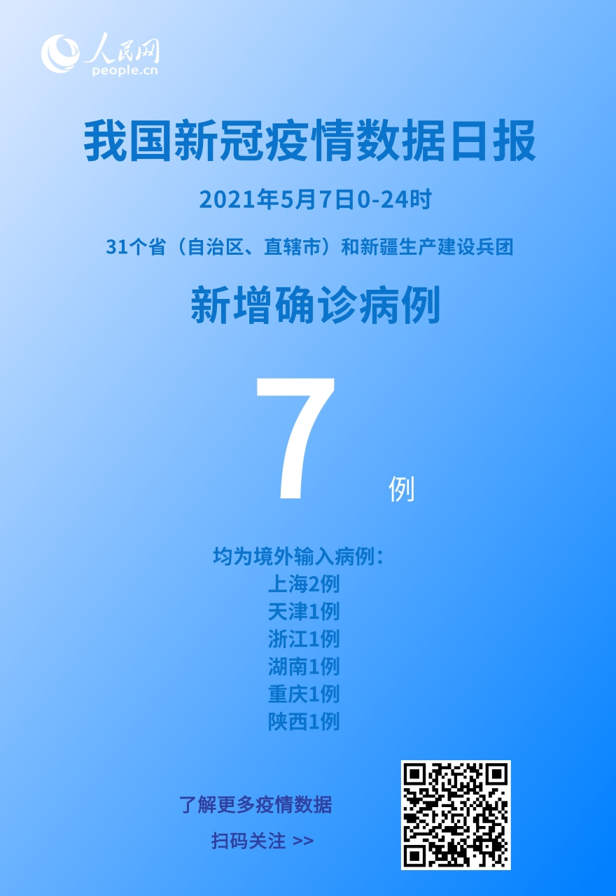 人民网北京5月8日电 (记者崔元苑)今日,国家卫生健康委于官网发布了截至5月7日24时新型冠状病毒肺炎疫情最新情况。5月7日0—24时,31个省(自治区、直辖市)和新疆生产建设兵团报告新增确诊病例7例,均为境外输入病例(上海2例,天津1例,浙江1例,湖南1例,重庆1例,陕西1例);无新增死亡病例;新增疑似病例4例,均为境外输入病例(均在上海)。