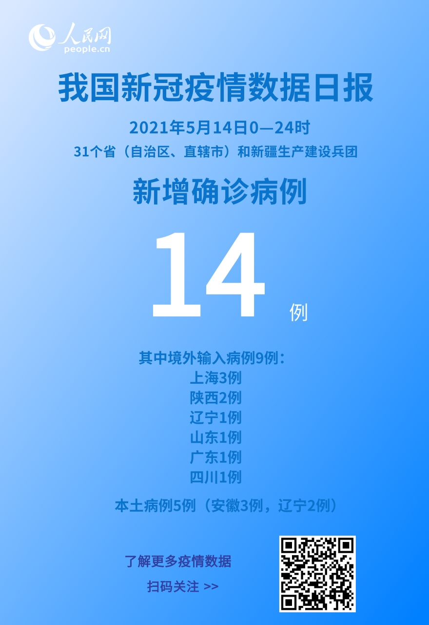 人民网北京5月15日电 (记者崔元苑)今日,国家卫生健康委于官网发布了截至5月14日24时新型冠状病毒肺炎疫情最新情况。5月14日0—24时,31个省(自治区、直辖市)和新疆生产建设兵团报告新增确诊病例14例,其中境外输入病例9例(上海3例,陕西2例,辽宁1例,山东1例,广东1例,四川1例),本土病例5例(安徽3例,辽宁2例);无新增死亡病例;无新增疑似病例。