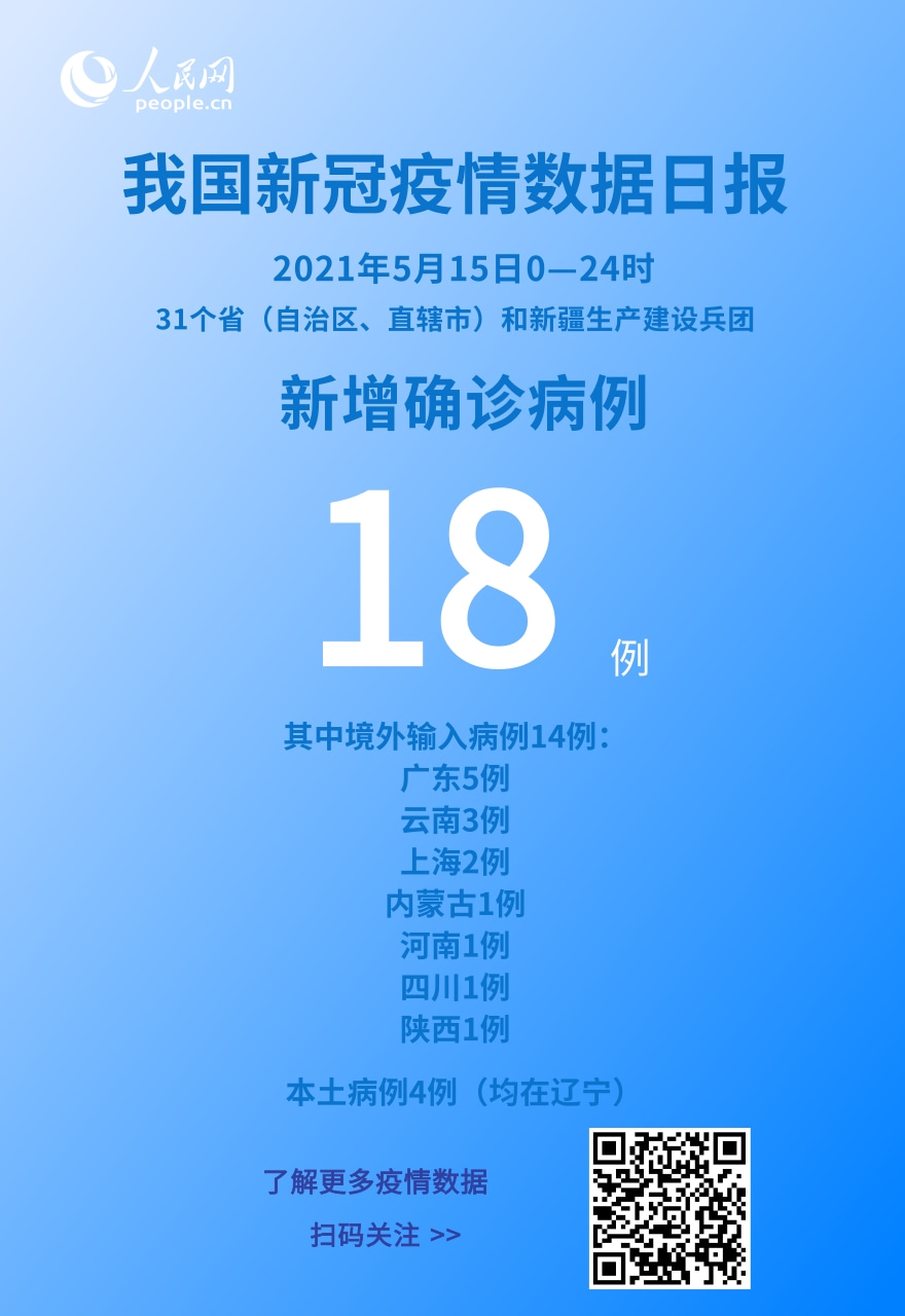 人民网北京5月16日电 (记者崔元苑)今日,国家卫生健康委于官网发布了截至5月15日24时新型冠状病毒肺炎疫情最新情况。5月15日0—24时,31个省(自治区、直辖市)和新疆生产建设兵团报告新增确诊病例18例,其中境外输入病例14例(广东5例,云南3例,上海2例,内蒙古1例,河南1例,四川1例,陕西1例),本土病例4例(均在辽宁);无新增死亡病例;新增疑似病例1例,为境外输入病例(在上海)。