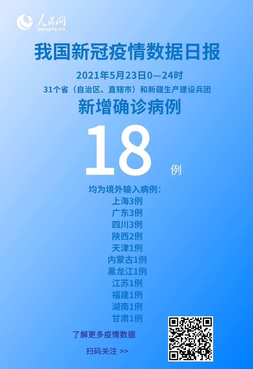 人民网北京5月24日电 (记者崔元苑)今日,国家卫生健康委于官网发布了截至5月23日24时新型冠状病毒肺炎疫情最新情况。5月23日0—24时,31个省(自治区、直辖市)和新疆生产建设兵团报告新增确诊病例18例,均为境外输入病例(上海3例,广东3例,四川3例,陕西2例,天津1例,内蒙古1例,黑龙江1例,江苏1例,福建1例,湖南1例,甘肃1例);无新增死亡病例;新增疑似病例1例,为境外输入病例(在上海)。