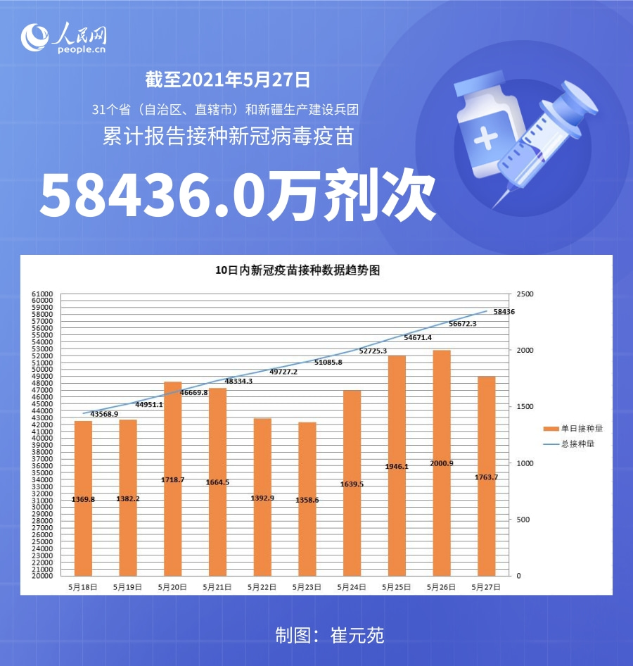 国家卫健委:截至5月27日全国累计接种新冠病毒疫苗58436.0万剂次