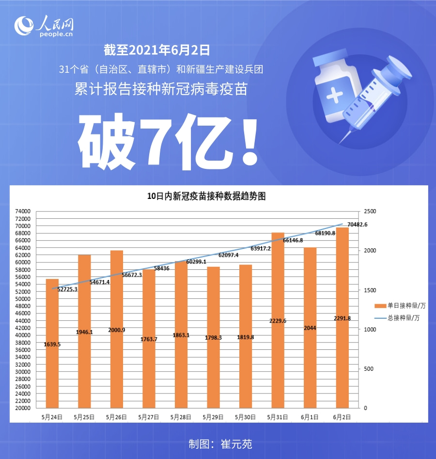 数据显示,6月2日,全国新冠病毒疫苗单日接种量达2291.8万剂次,创单日接种量新高。