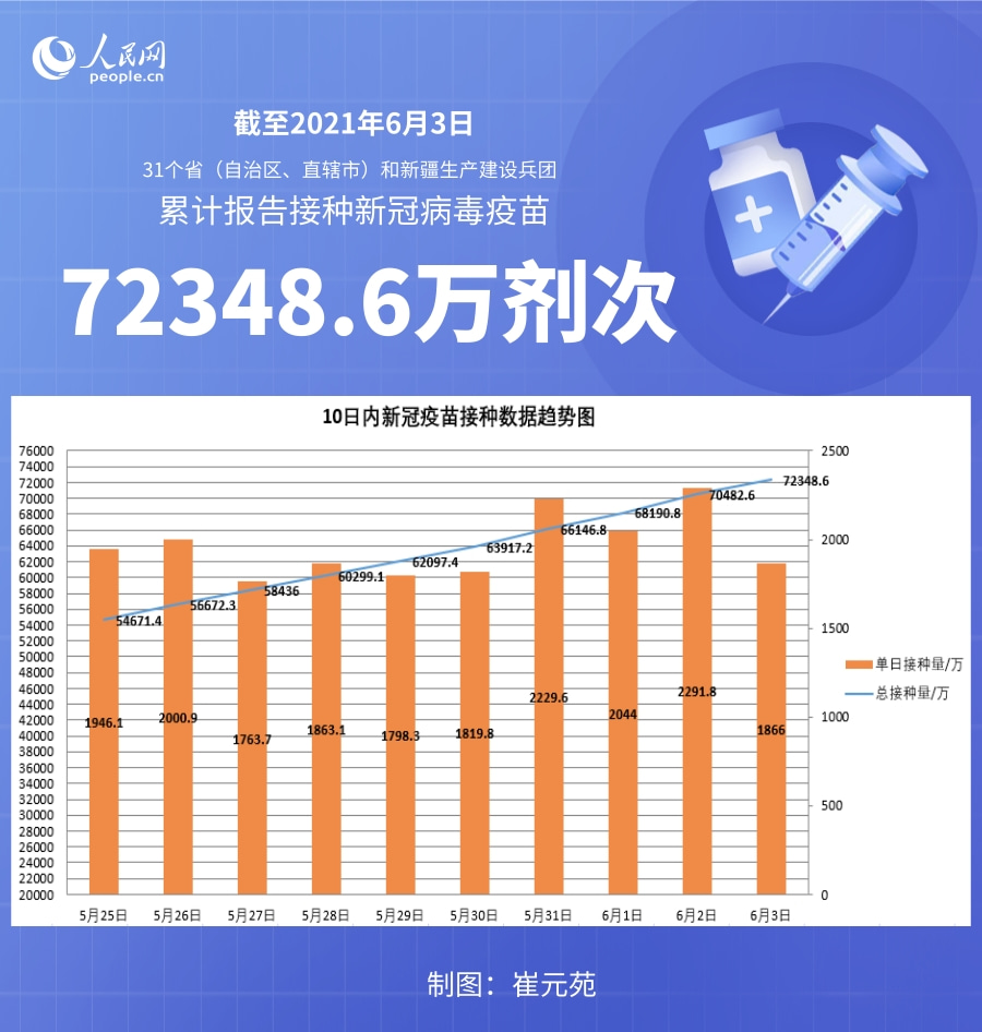 人民网北京6月4日电 (记者崔元苑)据国家卫生健康委官网消息,截至2021年6月3日,31个省(自治区、直辖市)和新疆生产建设兵团累计报告接种新冠病毒疫苗72348.6万剂次。
