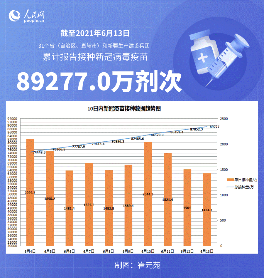 国家卫健委:截至6月13日全国累计接种新冠病毒疫苗89277.0万剂次