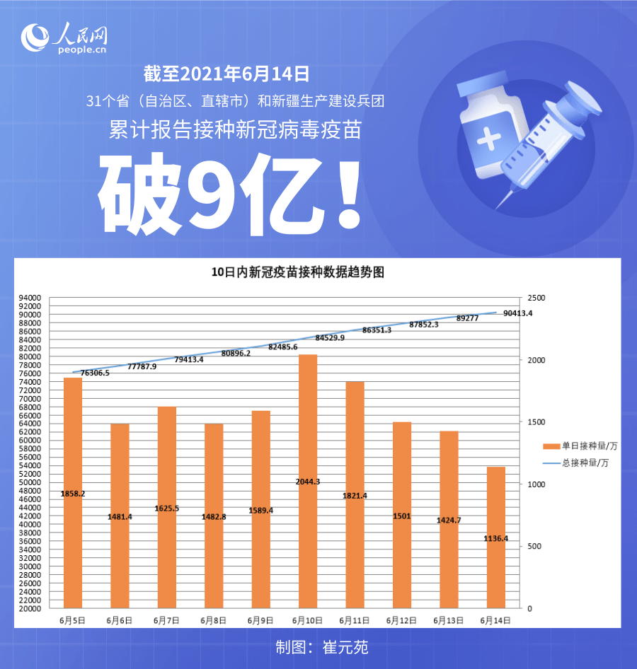 国家卫健委:截至6月14日全国累计接种新冠病毒疫苗90413.4万剂次