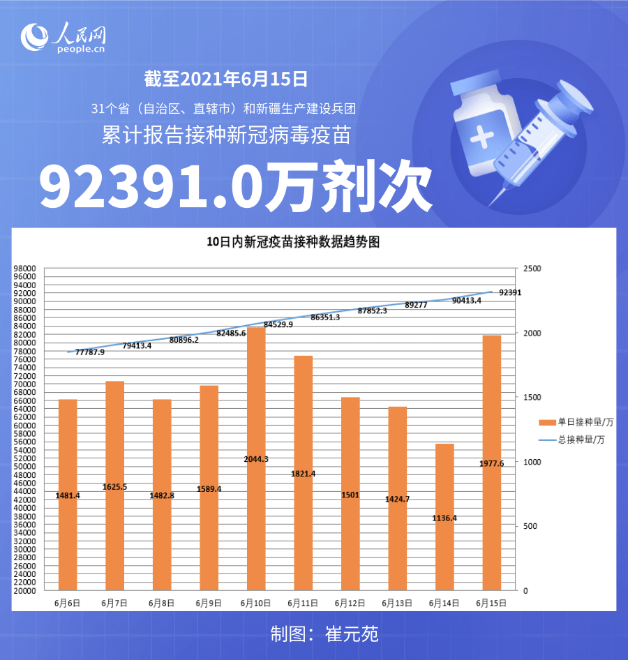 国家卫健委:截至6月15日全国累计接种新冠病毒疫苗92391.0万剂次