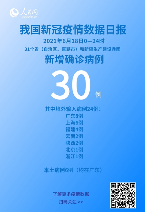 人民网北京6月19日电 (记者孙红丽)今日,国家卫生健康委于官网发布了截至6月18日24时新型冠状病毒肺炎疫情最新情况。6月18日0—24时,31个省(自治区、直辖市)和新疆生产建设兵团报告新增确诊病例30例,其中境外输入病例24例(广东8例,上海6例,福建4例,云南2例,陕西2例,北京1例,浙江1例),本土病例6例(均在广东);无新增死亡病例;新增疑似病例1例,为境外输入病例(在上海)。