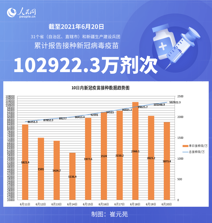 人民网北京6月21日电 (记者崔元苑)据国家卫生健康委官网消息,截至2021年6月20日,31个省(自治区、直辖市)和新疆生产建设兵团累计报告接种新冠病毒疫苗102922.3万剂次。
