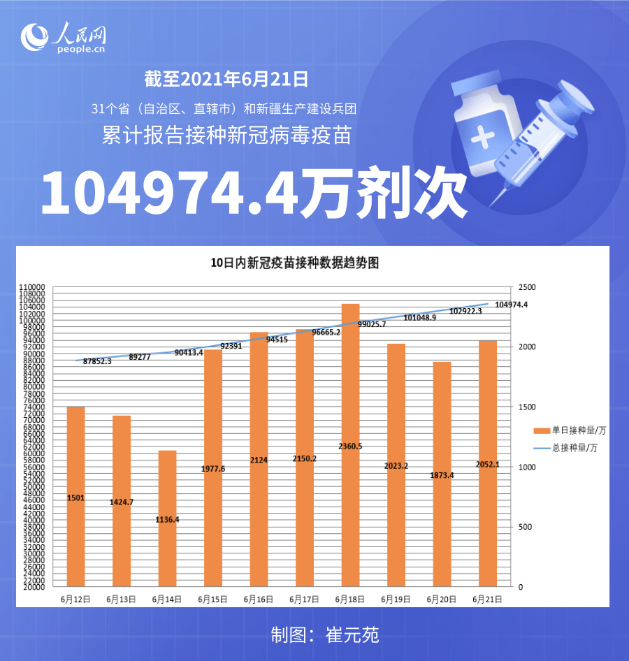 国家卫健委:截至6月21日全国累计接种新冠病毒疫苗104974.4万剂次