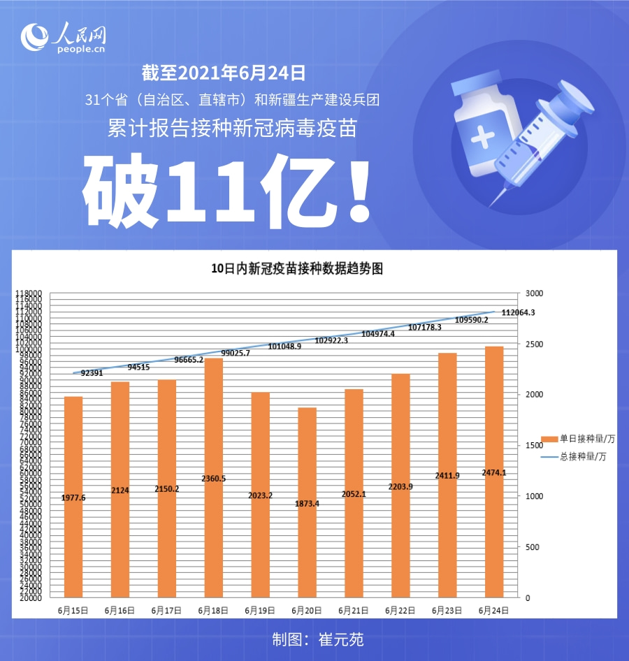 国家卫健委:截至6月24日全国累计接种新冠病毒疫苗112064.3万剂次