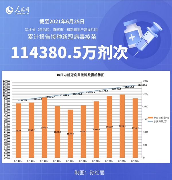 人民网北京6月26日电 (记者孙红丽)据国家卫生健康委官网消息,截至2021年6月25日,31个省(自治区、直辖市)和新疆生产建设兵团累计报告接种新冠病毒疫苗114380.5万剂次。