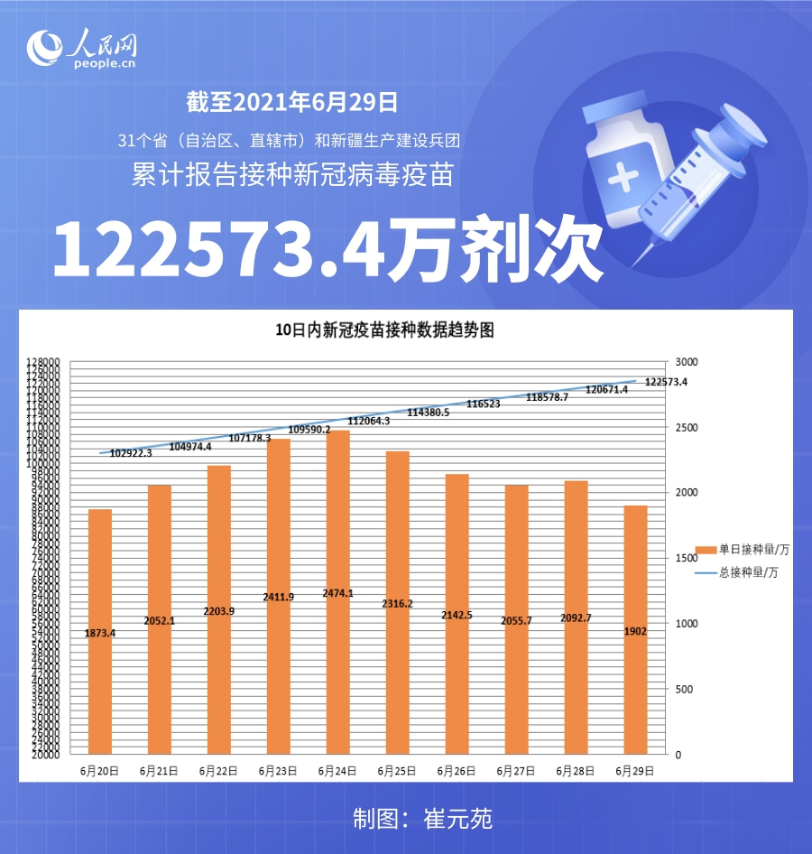 人民网北京6月30日电 (记者崔元苑)据国家卫生健康委官网消息,截至2021年6月29日,31个省(自治区、直辖市)和新疆生产建设兵团累计报告接种新冠病毒疫苗122573.4万剂次。