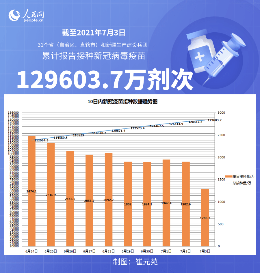 人民网北京7月4日电 (记者崔元苑)据国家卫生健康委官网消息,截至2021年7月3日,31个省(自治区、直辖市)和新疆生产建设兵团累计报告接种新冠病毒疫苗129603.7万剂次。