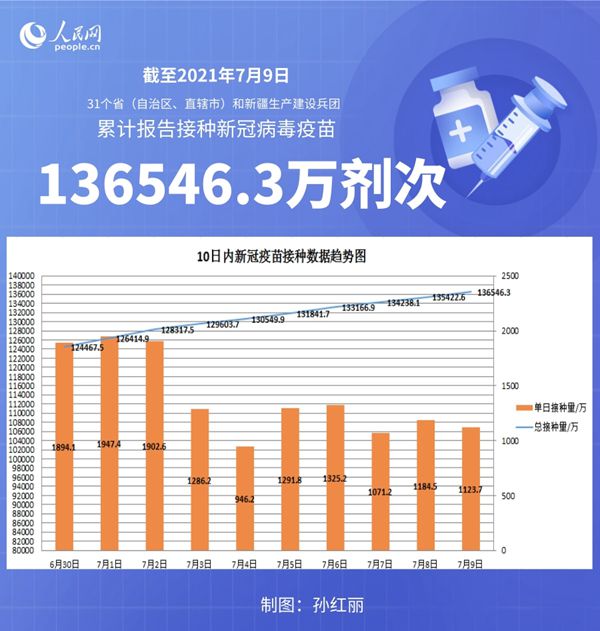 人民网北京7月10日电 (记者孙红丽)据国家卫生健康委官网消息,截至2021年7月9日,31个省(自治区、直辖市)和新疆生产建设兵团累计报告接种新冠病毒疫苗136546.3万剂次。
