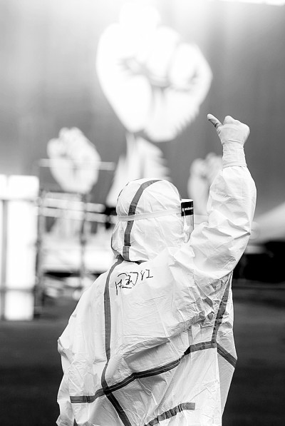 一名医务人员在武汉体育中心方舱医院前竖起拇指为自己和同伴加油鼓劲(2020年2月12日摄)。 新华社发