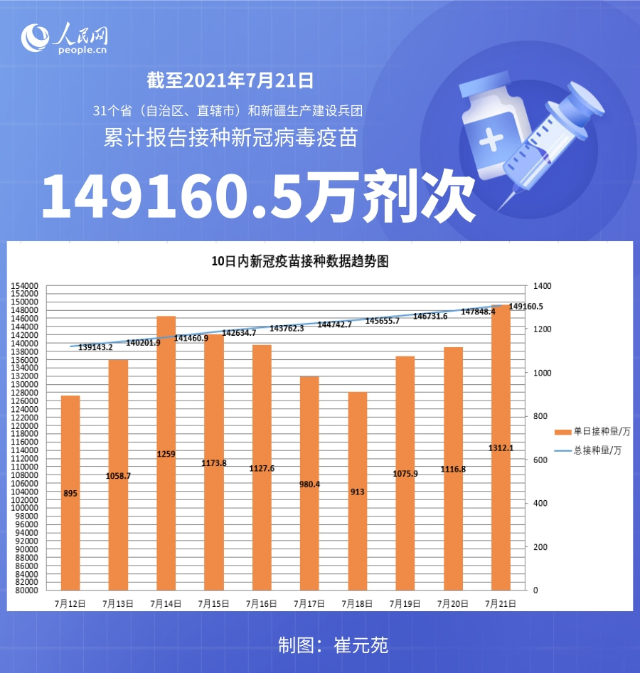 国家卫健委:截至7月21日全国累计接种新冠病毒疫苗149160.5万剂次