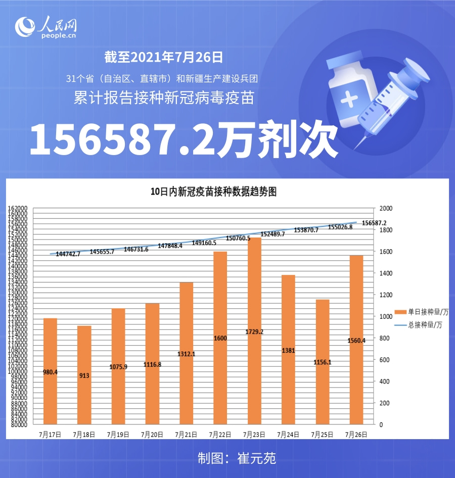 国家卫健委:截至7月26日全国累计接种新冠病毒疫苗156587.2万剂次