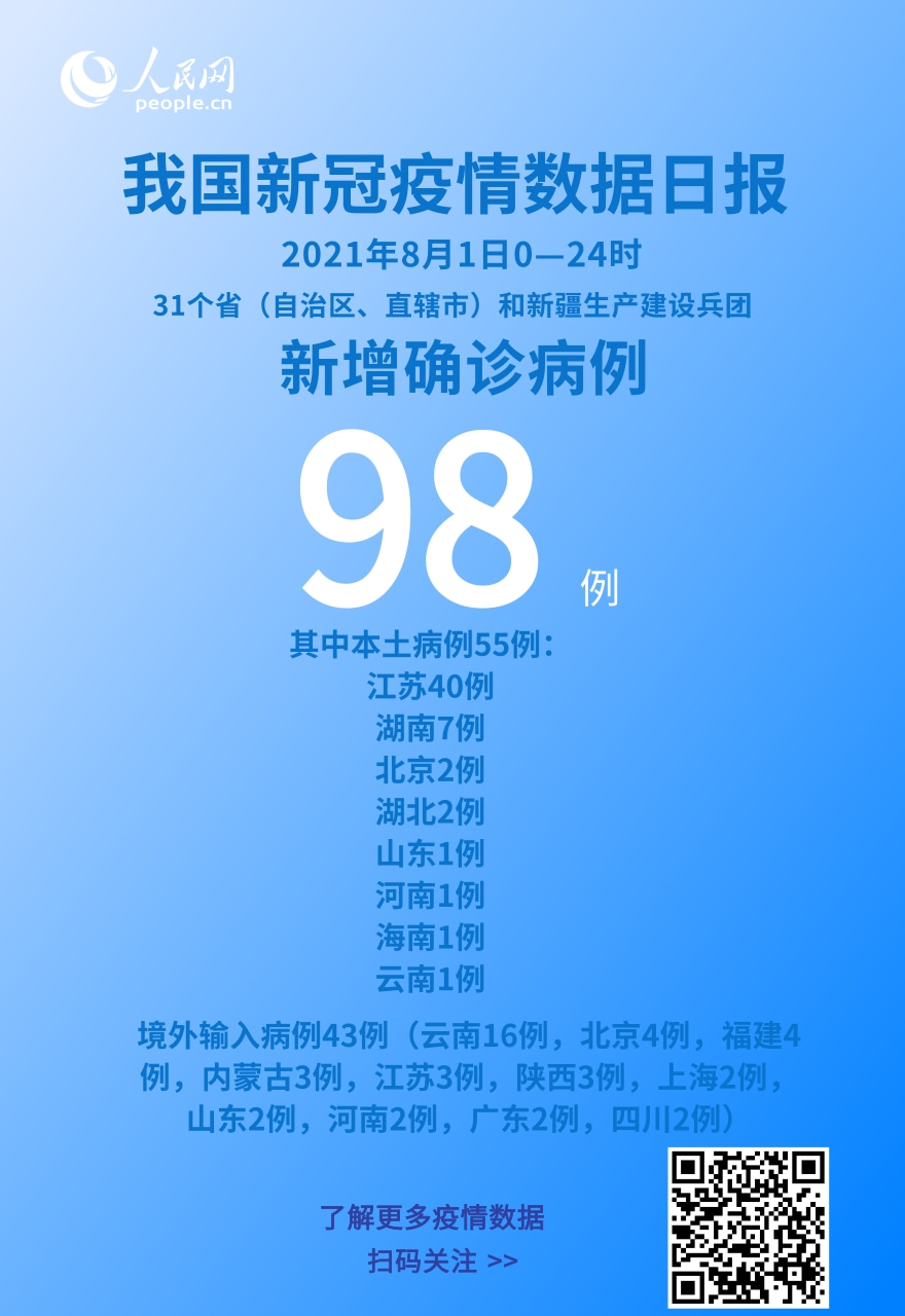 人民网北京8月2日电 (记者崔元苑)今日,国家卫生健康委于官网发布了截至8月1日24时新型冠状病毒肺炎疫情最新情况。8月1日0—24时,31个省(自治区、直辖市)和新疆生产建设兵团报告新增确诊病例98例,其中境外输入病例43例(云南16例,北京4例,福建4例,内蒙古3例,江苏3例,陕西3例,上海2例,山东2例,河南2例,广东2例,四川2例),本土病例55例(江苏40例,湖南7例,北京2例,湖北2例,山东1例,河南1例,海南1例,云南1例);无新增死亡病例;无新增疑似病例。