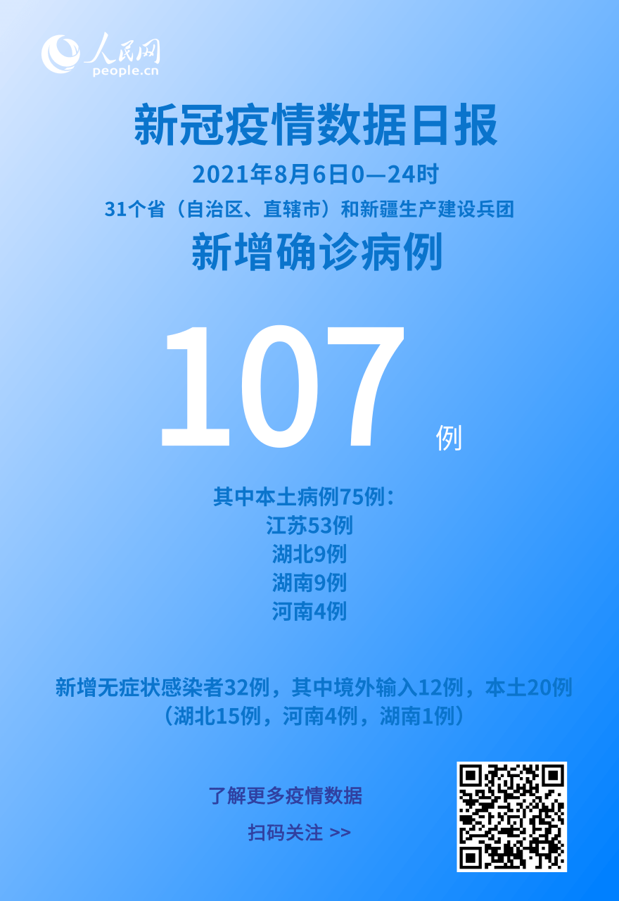 人民网北京8月7日电 (记者崔元苑)今日,国家卫生健康委于官网发布了截至8月6日24时新型冠状病毒肺炎疫情最新情况。8月6日0—24时,31个省(自治区、直辖市)和新疆生产建设兵团报告新增确诊病例107例,其中境外输入病例32例(云南11例,上海9例,天津5例,广东3例,四川2例,江苏1例,浙江1例),本土病例75例(江苏53例,湖北9例,湖南9例,河南4例);无新增死亡病例;新增疑似病例1例,为本土病例(在山东)。