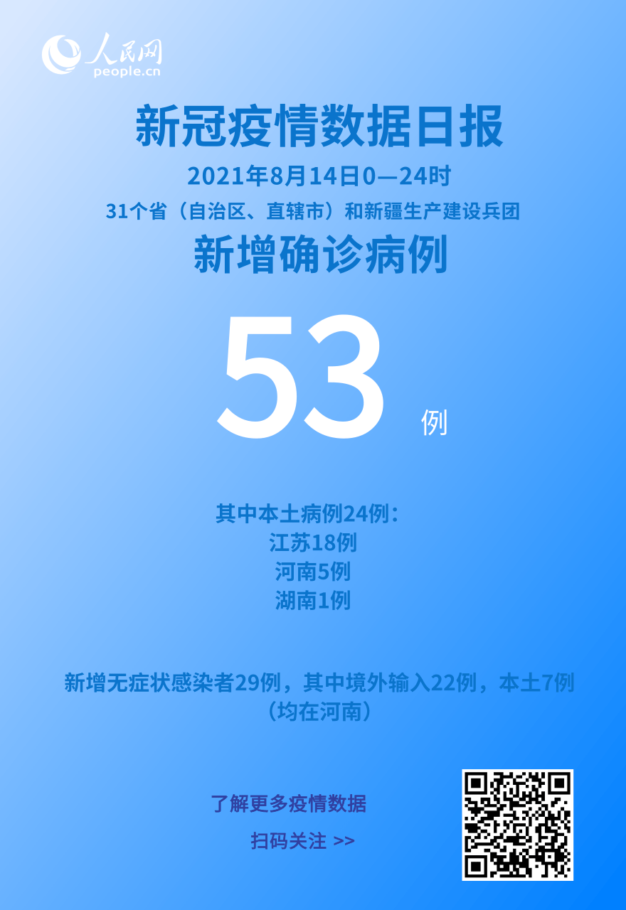 人民网北京8月15日电 (记者崔元苑)今日,国家卫生健康委于官网发布了截至8月14日24时新型冠状病毒肺炎疫情最新情况。8月14日0—24时,31个省(自治区、直辖市)和新疆生产建设兵团报告新增确诊病例53例,其中境外输入病例29例(广东13例,上海6例,天津3例,山东3例,云南3例,福建1例),本土病例24例(江苏18例,河南5例,湖南1例);无新增死亡病例;无新增疑似病例。