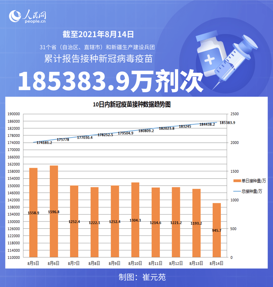 人民网北京8月15日电 (记者崔元苑)据国家卫生健康委官网消息,截至2021年8月14日,31个省(自治区、直辖市)和新疆生产建设兵团累计报告接种新冠病毒疫苗185383.9万剂次。