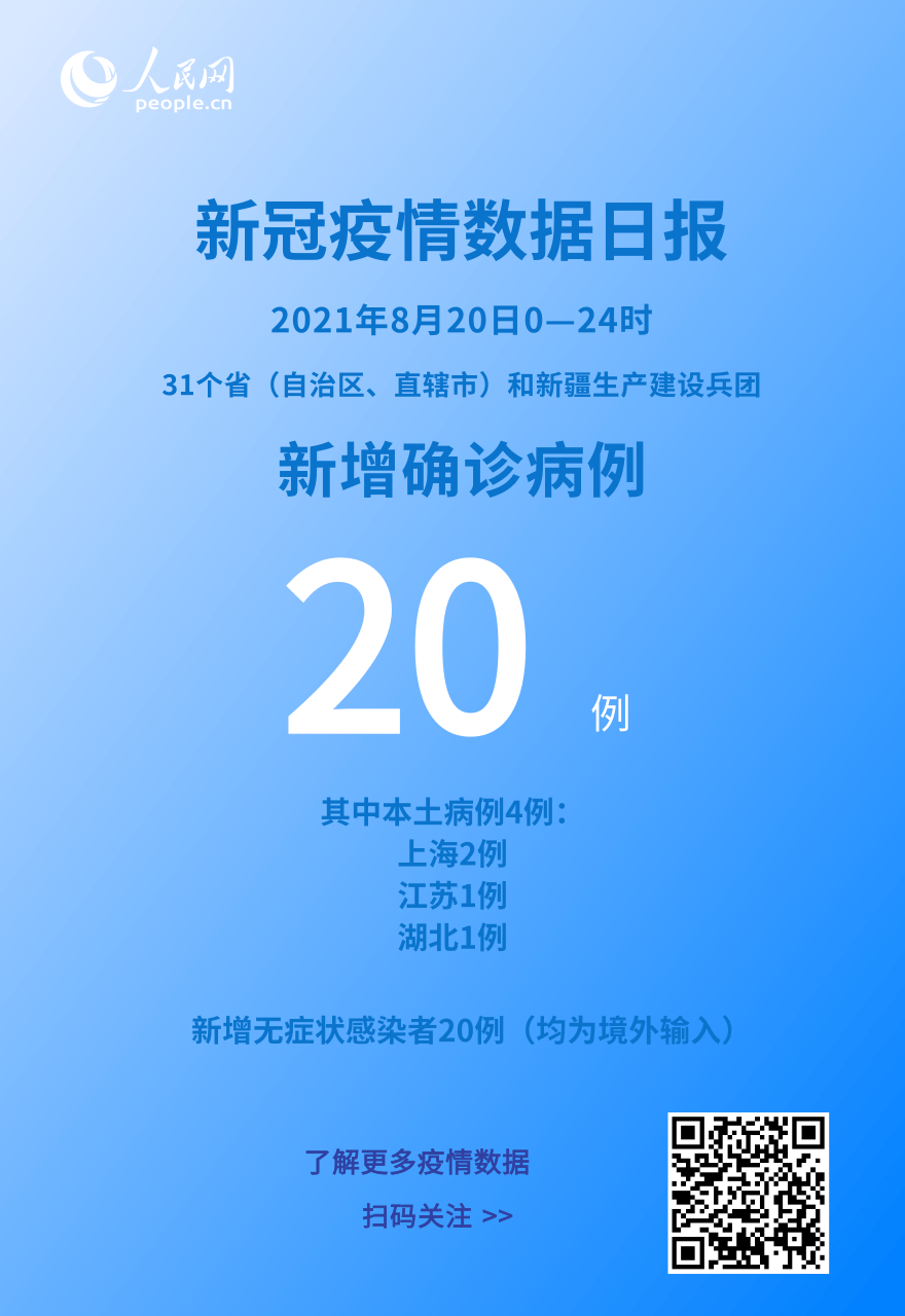 人民网北京8月21日电 (记者崔元苑)今日,国家卫生健康委于官网发布了截至8月20日24时新型冠状病毒肺炎疫情最新情况。8月20日0—24时,31个省(自治区、直辖市)和新疆生产建设兵团报告新增确诊病例20例,其中境外输入病例16例(广东4例,云南3例,北京2例,上海2例,浙江2例,天津1例,内蒙古1例,福建1例),本土病例4例(上海2例,江苏1例,湖北1例);无新增死亡病例;无新增疑似病例。