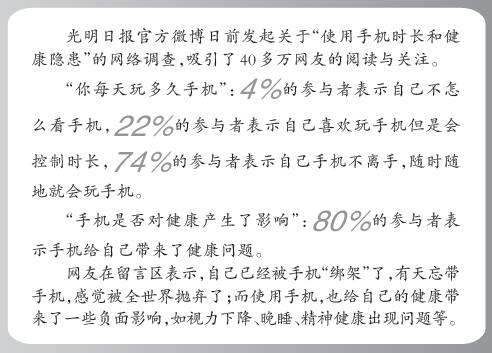 “白天工作很辛苦,下班回家玩手机是我一天最放松的时刻。”湖南长沙27岁的白领尹靖说,白天上班盯着电脑、手机沟通工作,晚上回家在手机上刷微博、抖音放松身心,已经成了她生活的常态。去年疫情期间,待在家里的她更是每天手机不离手,吃饭都在刷手机,“有段时间明显感觉到视力下降了,后来去测了下,近视度数增加了100多度。”尹靖说。