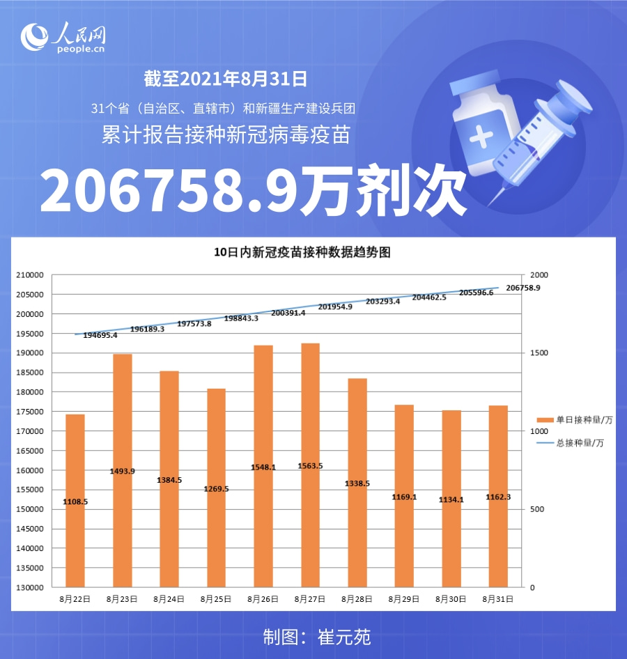国家卫健委:截至8月31日全国累计接种新冠病毒疫苗206758.9万剂次