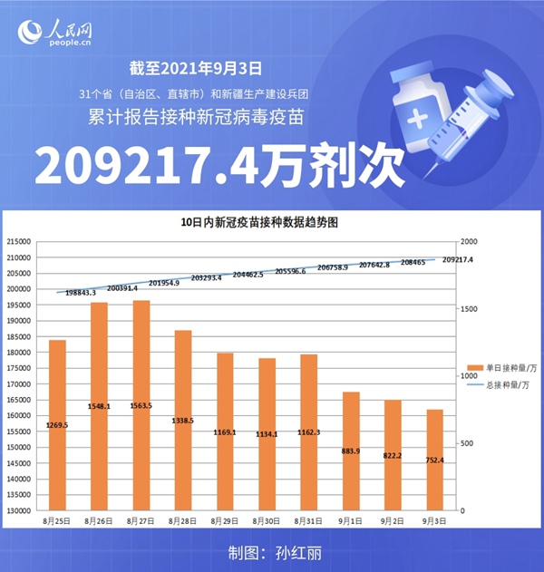 人民网北京9月4日电 (记者孙红丽)据国家卫生健康委官网消息,截至2021年9月3日,31个省(自治区、直辖市)和新疆生产建设兵团累计报告接种新冠病毒疫苗209217.4万剂次。