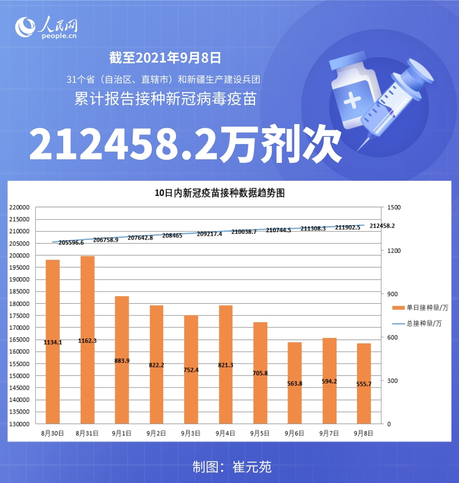 人民网北京9月9日电 (记者崔元苑)据国家卫生健康委官网消息,截至2021年9月8日,31个省(自治区、直辖市)和新疆生产建设兵团累计报告接种新冠病毒疫苗212458.2万剂次。