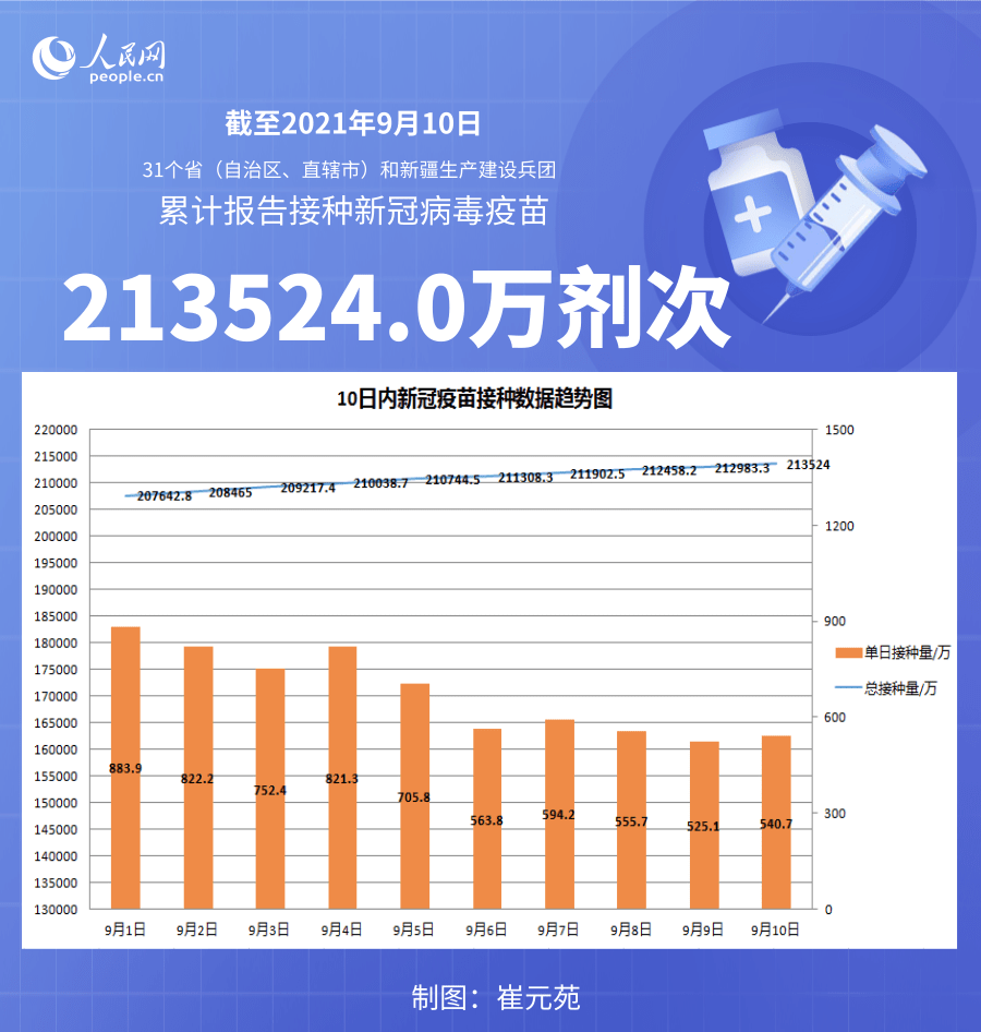 人民网北京9月11日电 (记者崔元苑)据国家卫生健康委官网消息,截至2021年9月10日,31个省(自治区、直辖市)和新疆生产建设兵团累计报告接种新冠病毒疫苗213524.0万剂次。