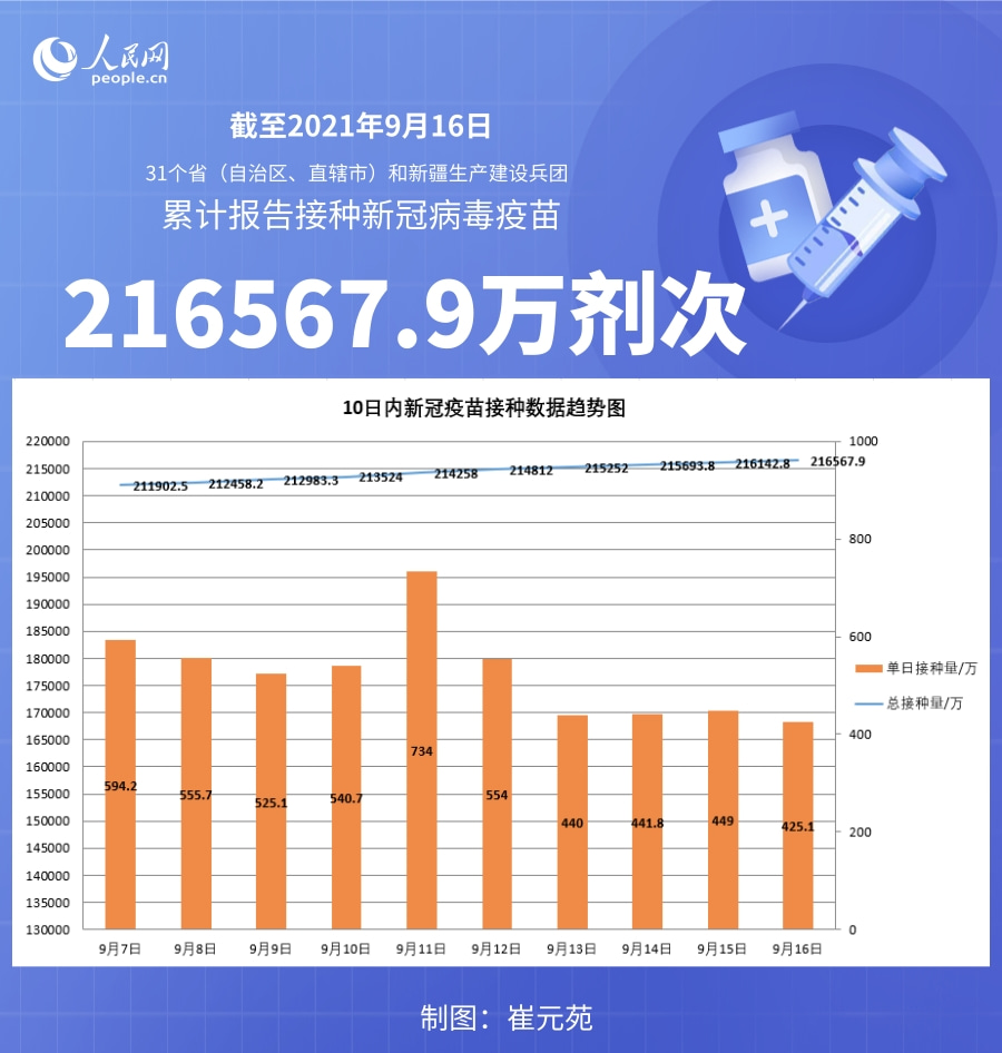 国家卫健委:截至9月16日全国累计接种新冠病毒疫苗216567.9万剂次