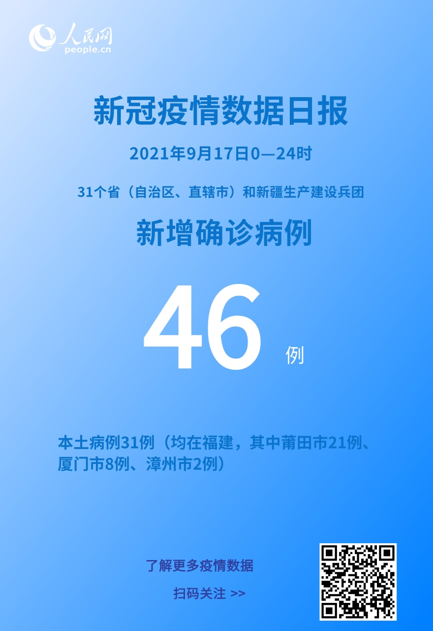 人民网北京9月18日电 (记者崔元苑)今日,国家卫生健康委于官网发布了截至9月17日24时新型冠状病毒肺炎疫情最新情况。9月17日0—24时,31个省(自治区、直辖市)和新疆生产建设兵团报告新增确诊病例46例。其中境外输入病例15例(云南9例,广东3例,上海2例,辽宁1例),含2例由无症状感染者转为确诊病例(均在广东);本土病例31例(均在福建,其中莆田市21例、厦门市8例、漳州市2例),含6例由无症状感染者转为确诊病例(均在福建)。无新增死亡病例。无新增疑似病例。