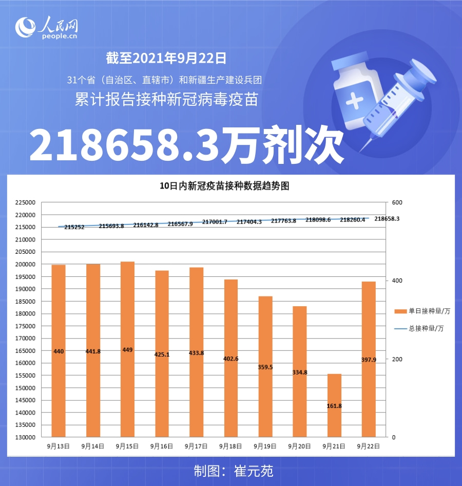 人民网北京9月23日电 (记者崔元苑)据国家卫生健康委官网消息,截至2021年9月22日,31个省(自治区、直辖市)和新疆生产建设兵团累计报告接种新冠病毒疫苗218658.3万剂次。