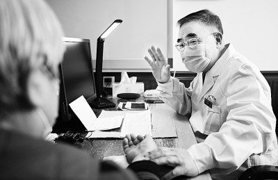 张伯礼(右)为患者把脉、问诊。 新华社发