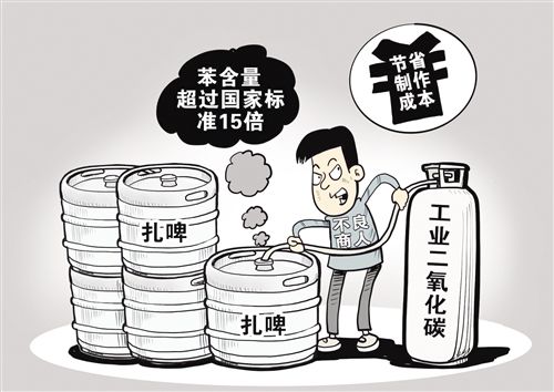 作为大众畅销饮品的扎啤,是在啤酒原浆中充入食品级二氧化碳制作出来的。近期,在市场监管总局部署的2021民生领域案件查办“铁拳”行动中,浙江省市场监管部门查办了一批扎啤非法添加案件。不法分子为节省制作成本,竟然用工业二氧化碳替代食品级二氧化碳制作扎啤,苯含量超过国家标准15倍。长期食用苯超标的产品,对身体健康有害。对此,除了广大消费者应擦亮眼睛,避免购买成分不明的自制啤酒,监管部门也应加大市场监管力度,斩断食品非法添加的违法链条,对违法犯罪分子依法查处,让其付出沉重代价。 (时 锋)