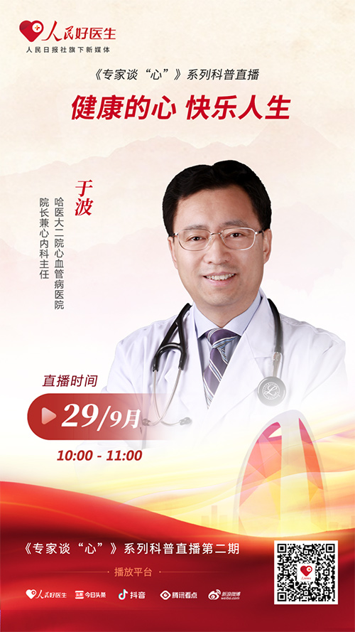 心血管疾病是一种常见的慢性非传染性疾病。心血管疾病的患病人群逐渐趋于年轻化。哪些行为或因素会导致疾病的发生?老年人和年轻人在疾病的预防方面存在什么区别?9月29日10:00-11:00,哈尔滨医科大学附属第二医院心血管病医院院长兼心内科主任于波将做客“人民好医生”APP直播间,为大众科普心血管疾病的预防知识。欢迎届时收看。