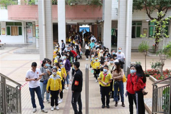 广东省佛山市南海区西樵镇第二小学,学生们正在排队等待接种新冠疫苗。 佛山市南海区第四人民医院供图