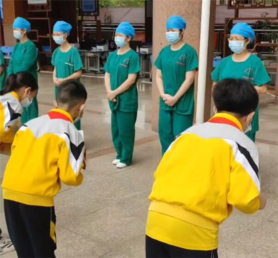 11月3日,在佛山市南海区第四人民医院的医护人员接种完上午场疫苗后,广东省佛山市南海区西樵第二小学的学生们在老师带领下,利用午休的时间,向现场医护人员鞠躬感谢,并深情演唱歌曲《有你就幸福》。
