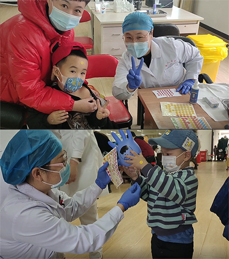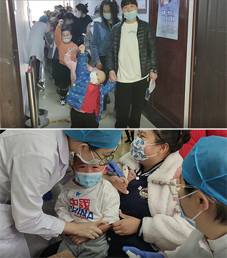 小朋友们在家长的带领下接种疫苗。黑龙江省大庆市大庆油田医院供图