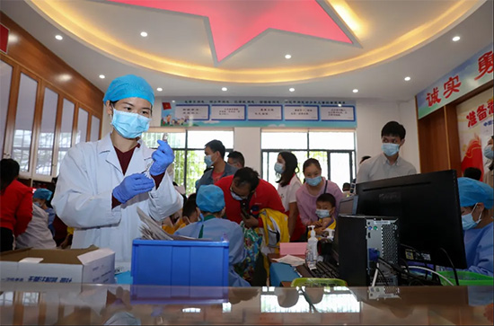 疫苗接种现场,孩子们正在老师和志愿者的指引下,迈着轻快的脚步,有序排队、等待接种。