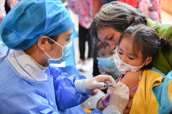 湖南省永州市零陵区安琪正央幼儿园,医护人员为小朋友接种新冠疫苗。新华社记者陈泽国 摄