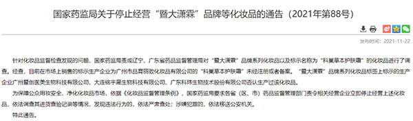根据通告,针对化妆品监督检查发现的问题,国家药监局责成辽宁、广东省药品监督管理局对“暨大潇霖”品牌系列化妆品以及标示名称为“科巢草本护肤霜”的化妆品进行了调查。