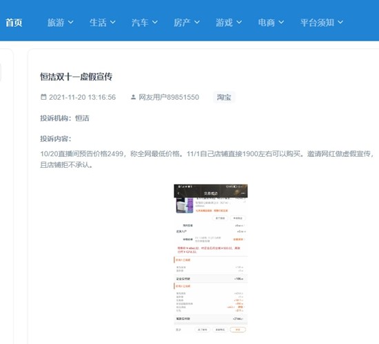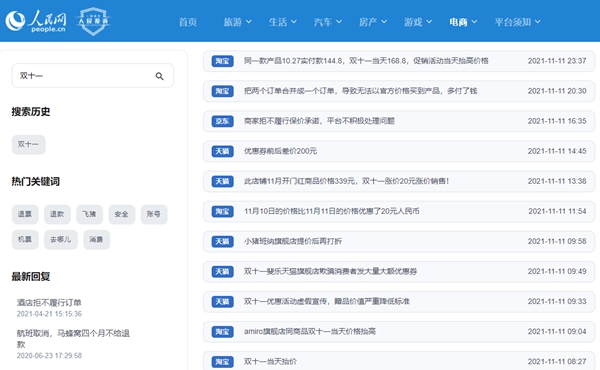 人民网“人民投诉”平台收到的消费者“双11”投诉截图