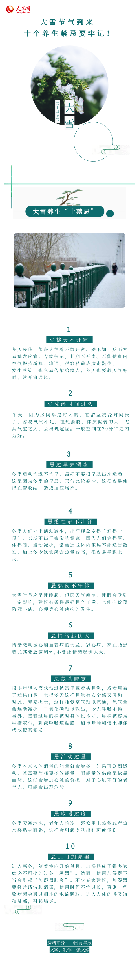 编者按:12月7日是农历二十四节气中大雪节气。《月令七十二候集解》说:“大雪,十一月节,至此而雪盛也。”“大雪”是冬季的第三个节气,标志着仲冬时节的正式开始。 俗话说“大雪进补,来年打虎”,大雪节气后大家应在养生方面注意什么呢?一图告诉你!