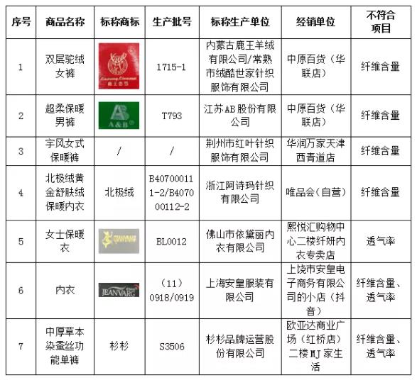 在明示的执行标准上,21款样品执行的是对“保温率”、“透气率”等功能性指标有考核的《针织保暖内衣》标准或企业标准。检测结果显示:7款样品的质量指标不符合明示标准要求。