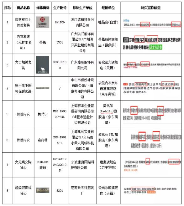 宣称为“加绒”、“保暖内衣”,但未执行保暖内衣标准的8款样品信息。来源:天津市消协官方微信截图