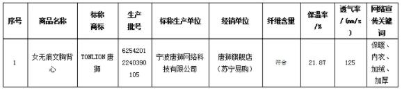 购自“苏宁易购”的标称商标为“TONLION唐狮”女无痕文胸背心样品保温率实测为21.87%,透气率实测为125mm/s,低于“针织保暖内衣”标准中保温率应≥30%、透气率应≥180mm/s的规定。